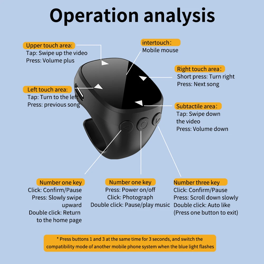 Feature: 1.Versatile Functionality: Supporting for short video apps and specific reading apps, this fingertip wireless remote control allows volume adjustment, truly freeing your hands. Also a selfie tool for capturing stunning photos while enjoying videos. 2.Premium Material: Crafted from high-quality ABS, this video scrolling remote control is drop-resistant, sweat-proof, and pressure-resistant, with a matte finish for a comfortable grip. 3.Wireless Control: Fully upgraded for seamless operation, this page turner scroller handles videos, photography, and e-books effortlessly. Browse presentations and scroll pages wirelessly for an enhanced experience. 4.Bluetooth-compatible 5.3: With advanced bluetooth-compatible connection technology, this finger remote offers stable usage up to a distance of 10 meters. 5.Ring Design: The mobile phone video remote features a compact, ergonomic design that fits snugly on fingers, preventing fatigue during extended use.Specification: Origin: Mainland China Product functions: short video page turning, page sliding up and down, e-book page turning, automatic click accumulation, photo shooting, video switching, song switching and pause, active mouse function Bluetooth version: Ver.5.3 Supported protocol: EDR+BLE Transmitting power: classII (-6dBm~+4dBm) Frequency (Hz): 2.40GHz~2.48GHz Bluetooth transmission distance: 10 meters Charging interface: Type-C Input current: DC5V Ring battery: 90mAh*1(401030) Continuous use time: 24 hours Charging time: about 1 hour Ring size: 39*36*31mm/1.54×1.42×1.22inch Packaging box size: 85*76.5*36mm Ring product weight: 13g Gross weight: 52g Note: